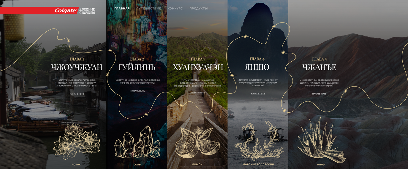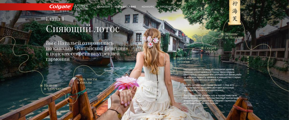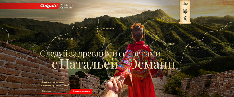 Бренд решил сделать упор на древних секретах Китая и создал линейку продуктов, которые содержат морскую соль, лотос, алоэ, водоросли и лимон – традиционные ингредиенты китайской медицины, соединив их с современными технологиями и знаниями Colgate. Мы развили тему древних китайских секретов и предложили дать каждому пользователю возможность отправиться в Китай за древними секретами новых ингредиентов линейки Colgate. На роль travel-гида лучше всего подошли онователи проекта FollowMeTo Наталья и Мурад Османн. Именно Наталья стала лицом кампании «Следуй за Древними секретами». Путешествие в Китай для пользователей начинается на сайте, где аудитория может прочесть мини-книгу про себя как главного героя: 5 глав, 5 ингредиентов, 5 приключений с Натальей Османн. Каждая глава – это поиск себя, поиск ингредиента, встреча с гуру и мудрецами и раскрытие древнего секрета.