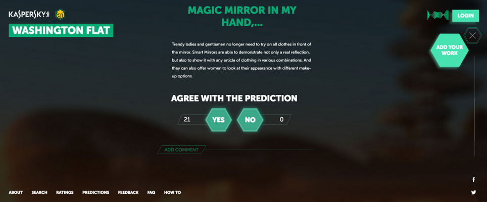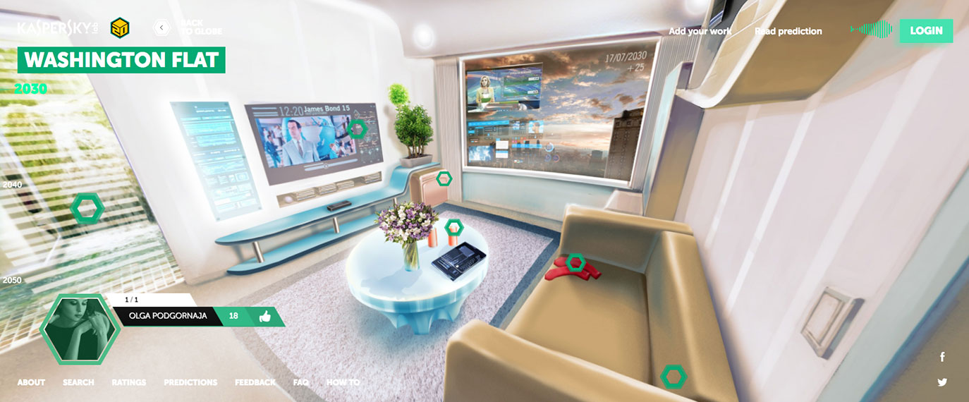 Рассказывая о том, как изменится привычный нам мир, мы предлагаем задуматься о кибербезопасности уже сейчас. На сайте вы найдете планету, которая поделена на географические участки, каждый из которых включает в себя прогноз, посвященный определенному аспекту жизни общества. Многие локации дополнены футуристическими изображениями и даже 360-панорамами. Любой дизайнер, иллюстратор или художник может загрузить на сайт свою работу, отображающую его представление о будущем, и стать частью проекта вместе с самыми известными футурологами нашей планеты.