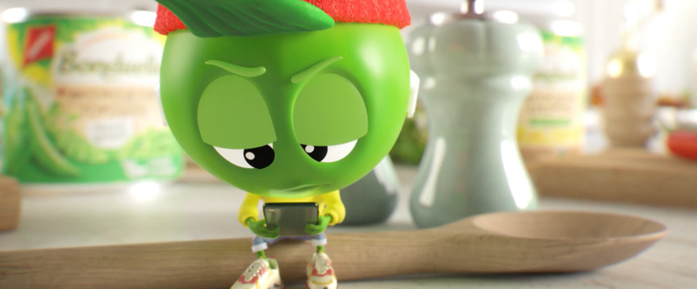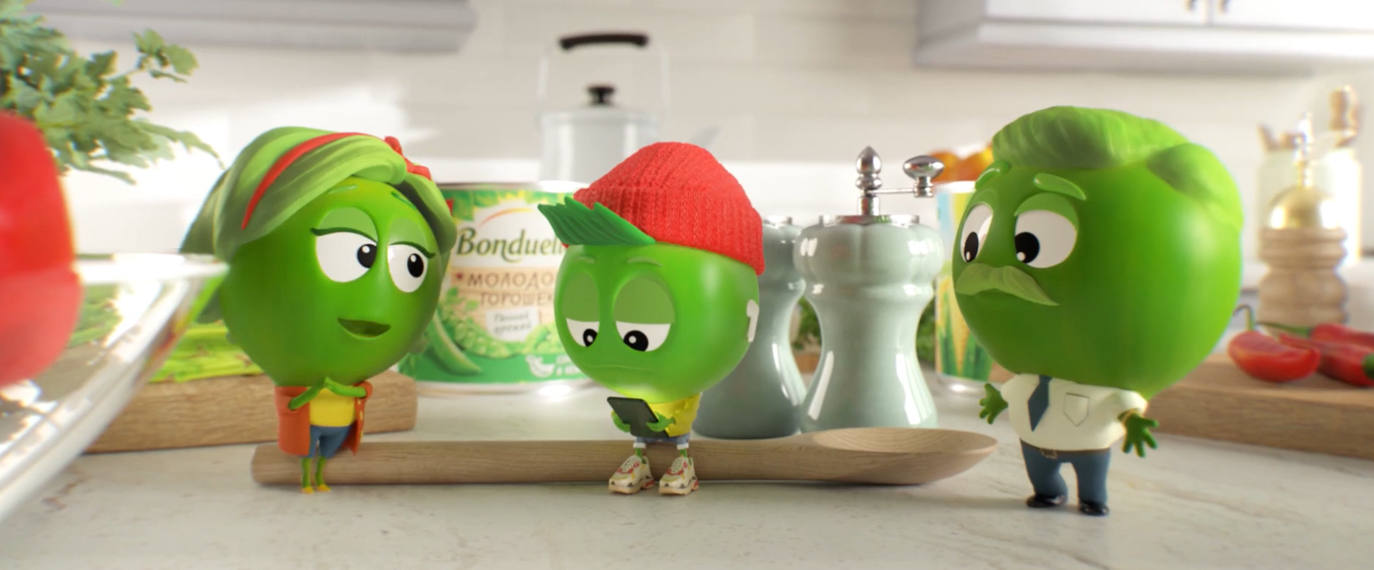 Молодой горошек — бунтарь, который наперекор родительскому мнению не желает становиться частью общего оливье, а хочет быть самостоятельным гарниром. Он, как и любой миллениал, не смотрит телевизор и считает его устаревшим. Поэтому он считает, что сниматься в рекламе для ТВ не круто, лучше сделать ролик для своего интернет-блога. Мы постарались тщательно проработать образ горошка: его одежду, внешность, характер — так, чтобы он не был похож на карикатурного персонажа, а напоминал настоящего современного подростка.