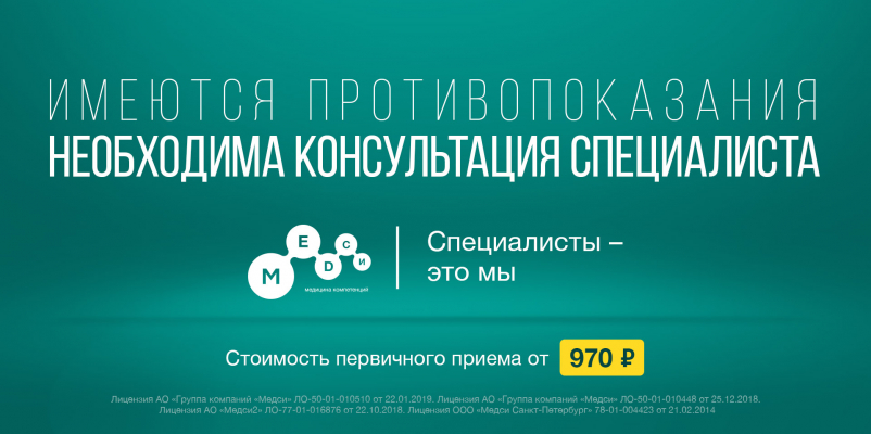 Каждый рекламный носитель фармацевтических препаратов и услуг юридически обязан содержать предупреждение о необходимости консультации со специалистом. Таким образом, каждый из таких рекламных носителей, по факту, является рекламой квалифицированной медицинской помощи, которую можно получить в клиниках Медси.