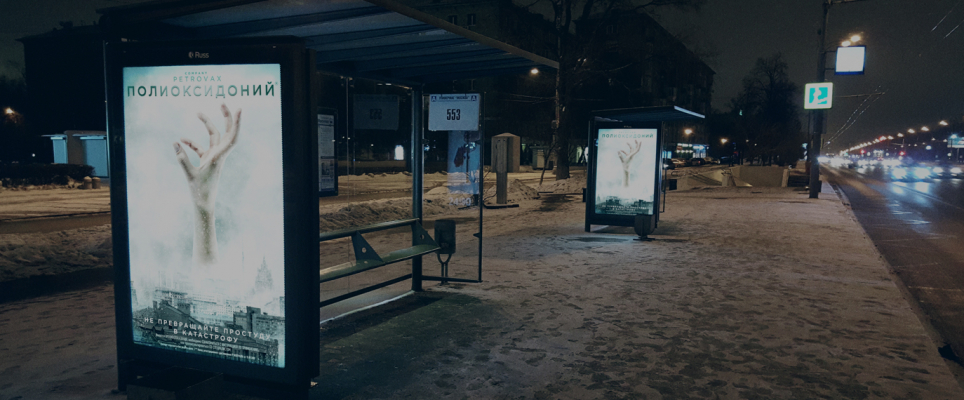 В пик сезона простуд вместе с НПО Петровакс Фарм мы запустили рекламную кампанию препарата от простуды и гриппа «Полиоксидоний», центральным элементом которой стал ролик, стилизованный под трейлер фильма-катастрофы, где больные похожи на зомби, а эпидемия гриппа превращается в драматический апокалипсис.