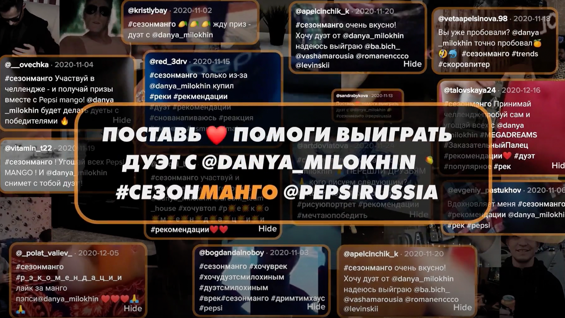 В России манго – дорогой экзотический фрукт, который пробовали далеко не все. Более того, цена на сам фрукт для многих является отталкивающей, а в некоторых городах его просто не найти. Но с приходом Pepsi Mango на полки магазинов, этот вкус сможет попробовать каждый и поделиться им с другими! Мы обратились к самому активному поколению Z и запустили первый сезон манго в России с молодым и популярным инфлюенсером Даней Милохиным! Pepsi открыл сезон Mango на платформе Tik Tok, предлагая всем пользователям принять участие в одноимённом челлендже. Кроме Дани к нам присоединились его друзья и другие звёзды платформы. Сами же пользователи быстро влились в челлендж, для участия в котором нужно было приобрести напиток и записать под брендированный джингл свою видеоработу. Самые креативные участники получили призы, а также дуэты с самим Даней!