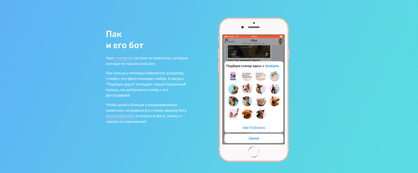 Мы создали стикерпак, в котором каждый стикер посвящен одному из питомцев, нуждающихся в новом доме. Биографию любого из понравившихся питомцев можно легко узнать, отправив стикер с его изображением боту @adoptapackbot – тот тут же пришлет его анкету, фотографии и советы по уходу за животным. Каждый раз, как к приюту попадает новый бездомный малыш, набор пополняется новым стикером, а как только животное находит новый дом, этот стикер исчезает из пака.