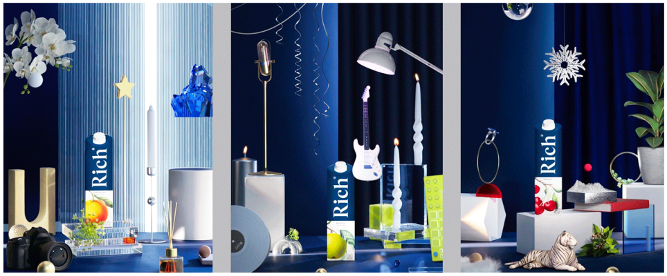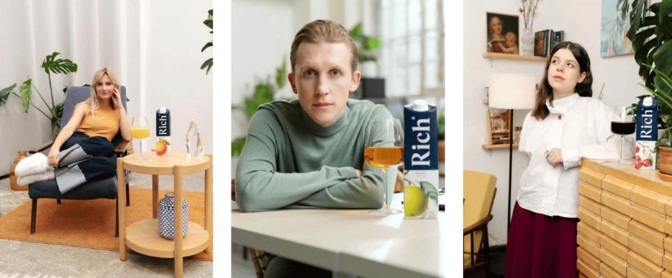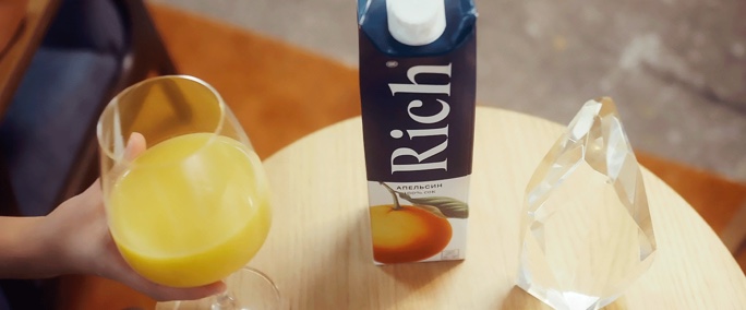 В рамках кампании был запущен спецпроект на theblueprint.ru совместно с художницей Моникой Дубинкайте, 3D-художницей и иллюстратором Варей Щукой и композитором и музыкантом Костей Похвалиным (Poco Cox). Авторы спецпроекта Rich «Вдохновляясь новым» создали необычный арт-объект — digital-триптих, посвященный их любимым занятиям. Он вдохновлен элементами новой упаковки бренда и призван рассказать об идеальном моменте наедине со своим увлечением. В видеоролике же героиня исследовала упаковку Rich, следуя от одной буквы логотипа к другой вслед за апельсином, который привел ее к моменту наедине с собой и наслаждению вкусом Rich. На digital-фасаде к/т “Октябрь” ролик преобразился — в нем исследование каждой буквы происходило одновременно, благодаря чему они сложились в логотип бренда.