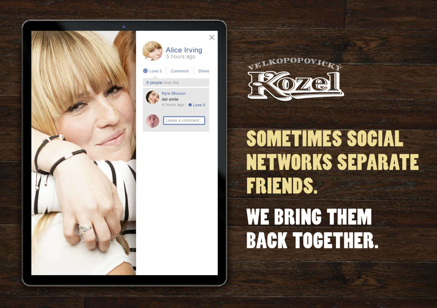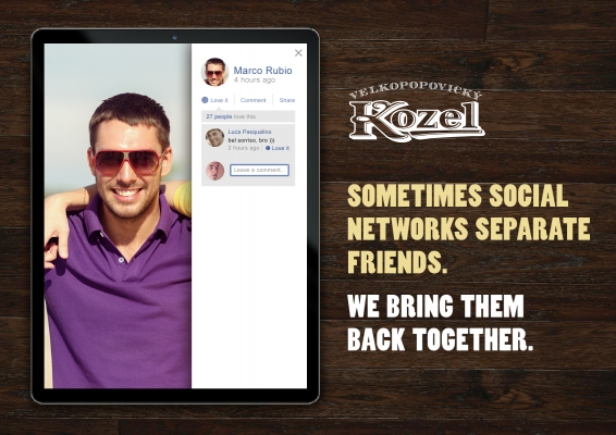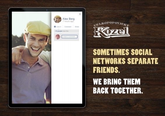 Вы когда-нибудь замечали, что зачастую аватарки пользователей как бы вырезаются из фотографии общего снимка друзей? Именно на таких фотографиях друзья оказываются «разделенными», и как раз это нам удалось проиллюстрировать в нашей серии принтов. И именно в этой̆ ситуации, когда социальные сети стали врагами реальной дружбы, на помощь приходит бренд Velkopopovický Kozel, который̆ на протяжении долгих лет выступал и выступает за ценности настоящей человеческой̆ дружбы.